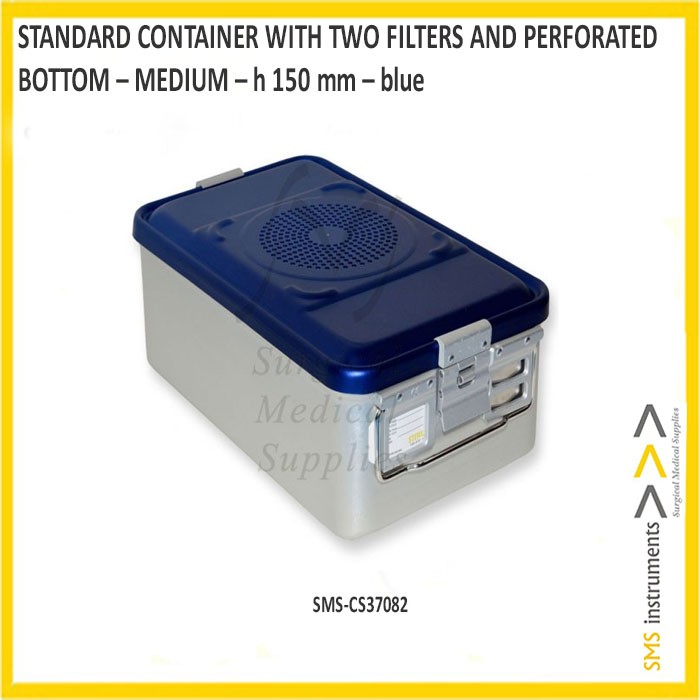 The Standard Container with Two Filters and Perforated Bottom – Medium – h 150 mm – Blue from NAZMED SMS SDN BHD, under the trusted SMS brand, is a high-performance sterilization solution engineered for safe, efficient, and repeatable sterilization cycles in healthcare facilities worldwide. Designed from premium-grade anodized aluminum, this medium-height 150 mm sterilization container combines durability, hygiene, and modern engineering to meet the demanding standards of hospital sterilization units and surgical centers.