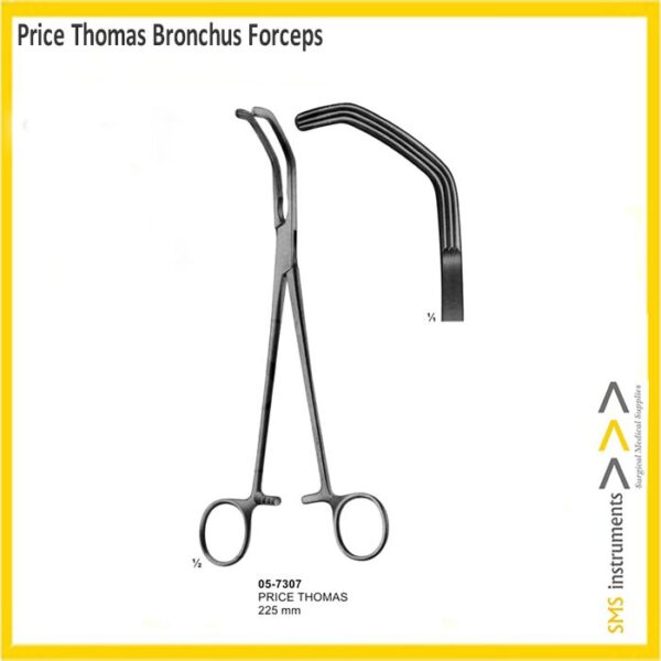 Price Thomas Bronchus Forceps is a ratcheted, finger ring instrument used to grip, hold, and move parts of the bronchus (large airways) while suturing or stapling during procedures involving the lungs or trachea. Because the tissue of the bronchus is dense, this instrument has unique tips that have long serrations the entire length of the jaws. This instrument has long jaws that are available curved or angled, left or right, so as to be utilized most efficiently on either side of the patient. This product is Duoble Angled and overall length is 225 mm.